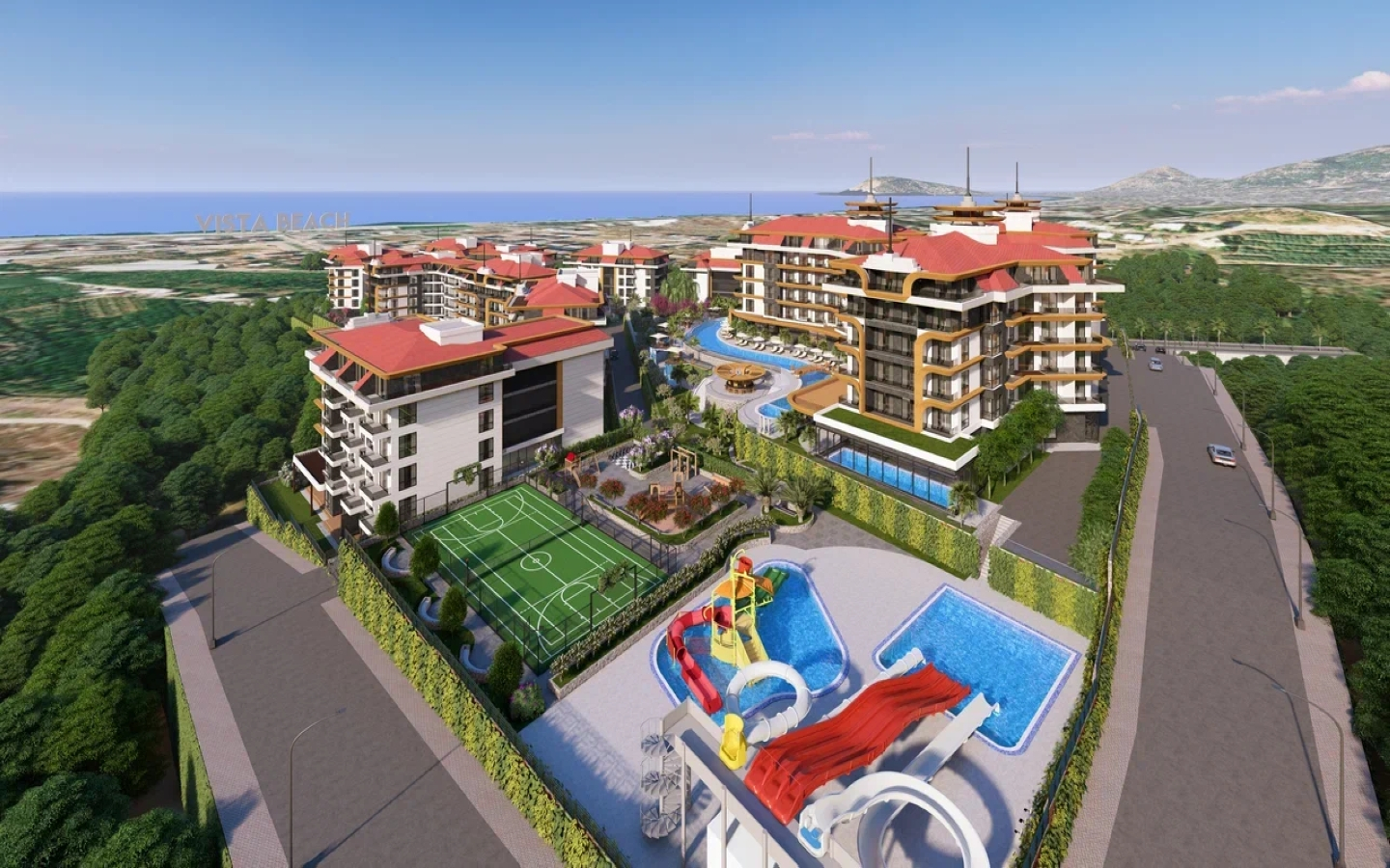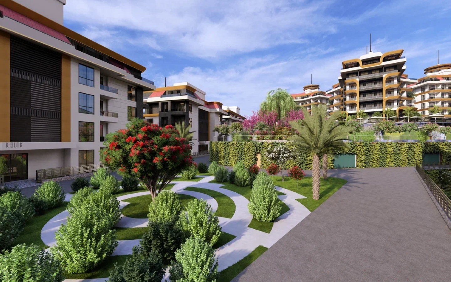 Projektet ligger kun 800 meter fra stranden og 8 km fra Alanya centrum, hvilket giver nem adgang til byliv, daglige fornødenheder og underholdning.